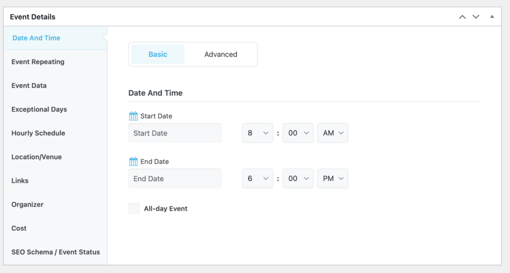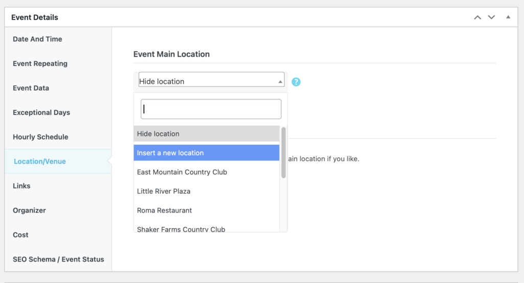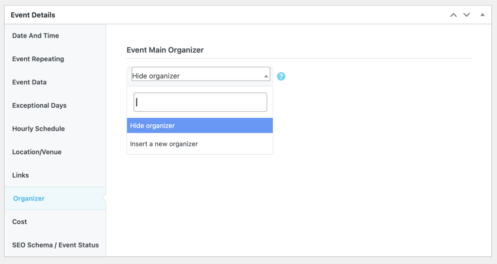 Click “Organizer” and choose an Organizer for the event, if any