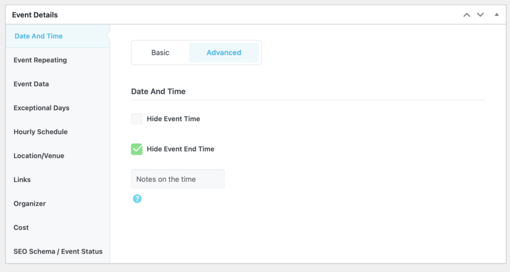 If there is no end time, click Advanced and check “Hide Event End Time”