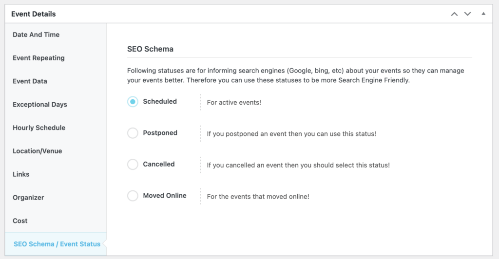 Click “SEO Schema/Event Status” if the event is postponed, cancelled or moved online