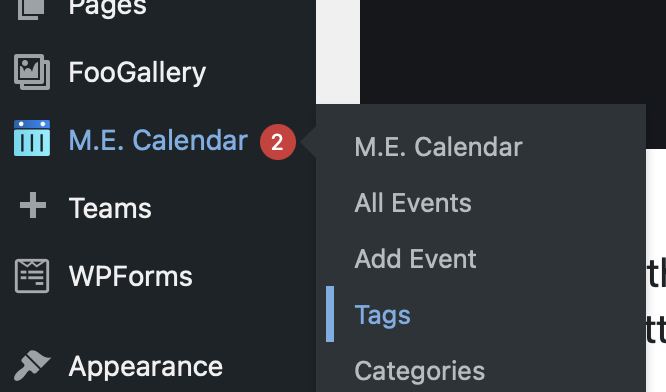 From the side admin menu, hover over or click on “M.E. Calendar” and then click “All Events” to see a listing of all events.