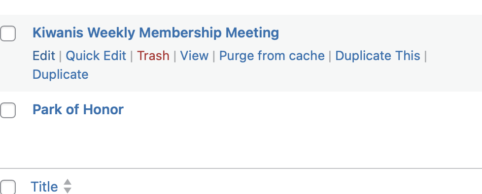 Hover over the meeting you wish to edit and then click the “Edit” or “Quick Edit” as appropriate. If unsure, click “Edit” which gives you the ability to edit everything.