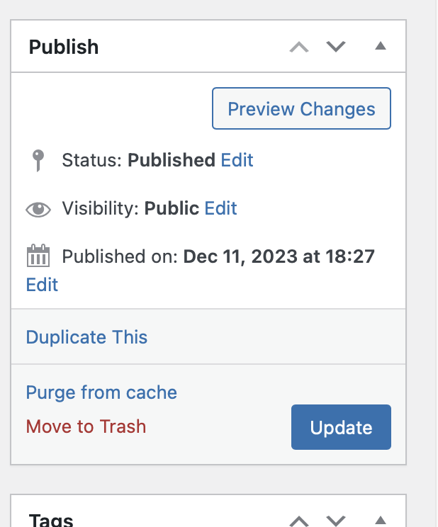 If you hit “Edit,” make the desired changes to the event and then hit the “Update” button near the top of the right column in the “Publish” block.