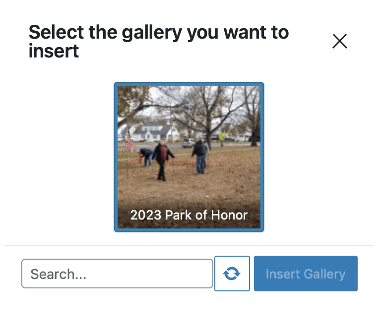 Search or click on the gallery you want to insert and then click “Insert Gallery”