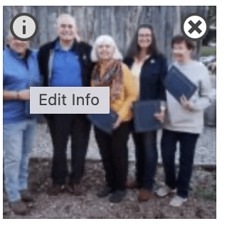 To add a caption or other details about a photo, hover over the photo’s thumbnail and click the “i” in the circle, add your details, and then the “Save Attachment Details” button.