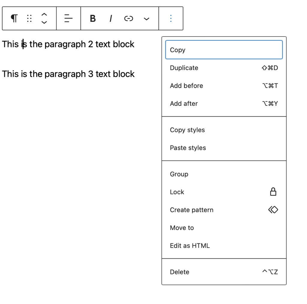 Another way to add the new block is to click anywhere on paragraph 2. You’ll see a little pop up menu with three dots on the right. Click on the 3 dots: