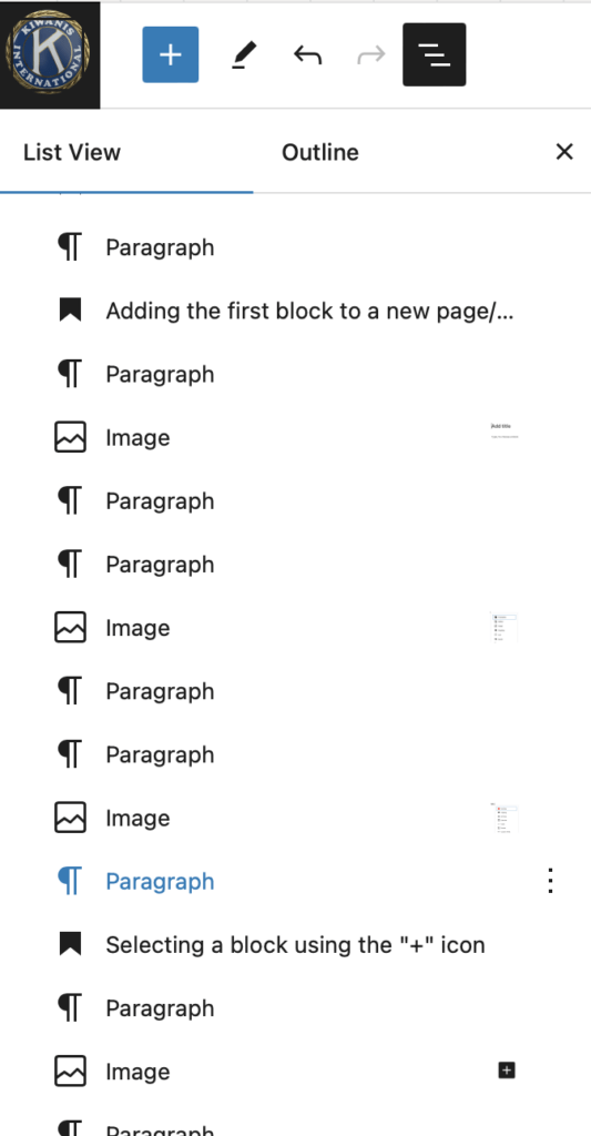 It can be very helpful to turn on the “List View” so you can get a bird’s eye view of all your blocks on the page. To do that, click on the three dashed lines in the upper left part of the editor: