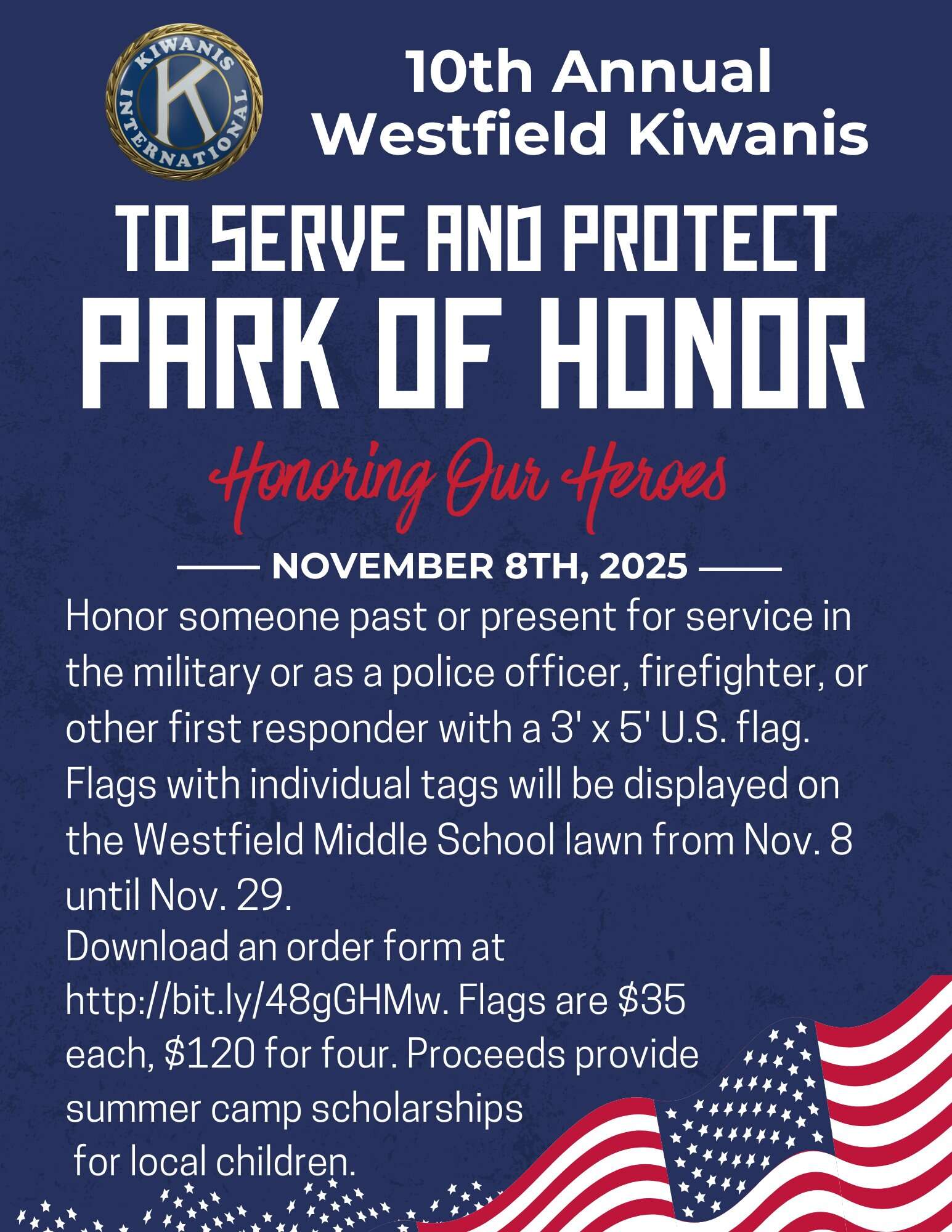 Westfield Kiwanis Club’s “To Serve and Protect Park of Honor” returns to the Westfield Middle School lawn in November. Patrons can honor active duty military, veterans, police officers, firefighters, or first responders, past or present, for their service. Download an official order form today.